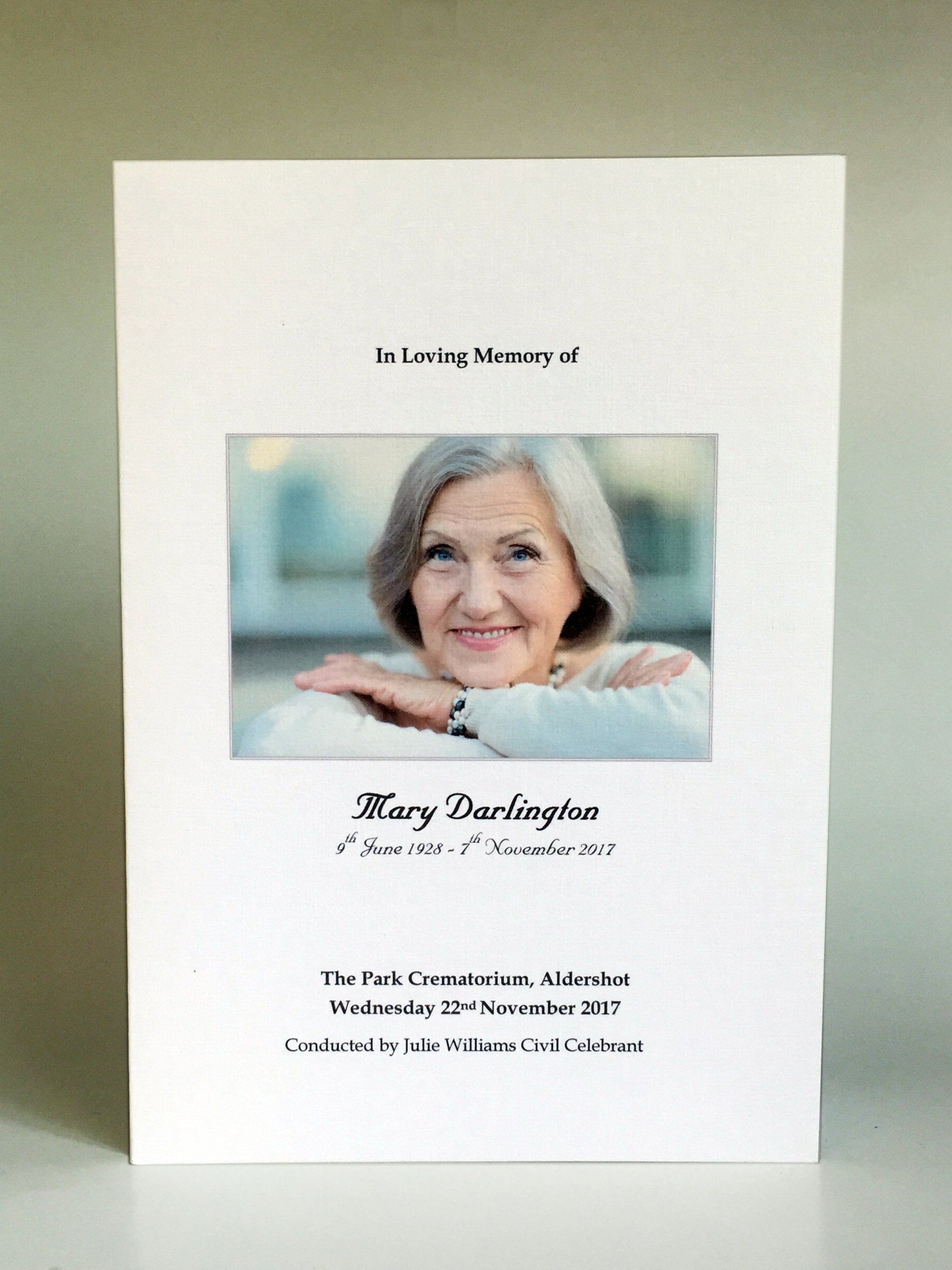 Bringing everything together in one booklet, an order of service includes the funeral running order, hymns, speakers, details of the wake, donations